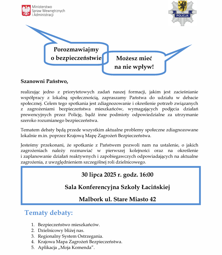 W związku z zaplanowaną debatą społeczną poświęconą bezpieczeństwu zapraszamy wszystkich mieszkańców powiatu malborskiego do udziału w spotkaniu, które odbędzie się 30 lipca 2025 r. o godzinie 16:00 w Sali Konferencyjnej Szkoły Łacińskiej w Malborku na ul. Stare Miasto 42.