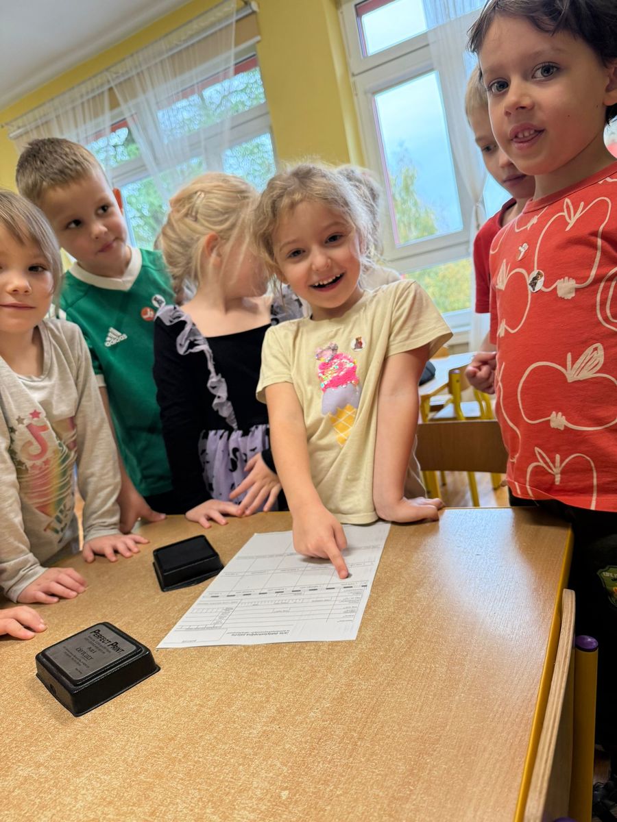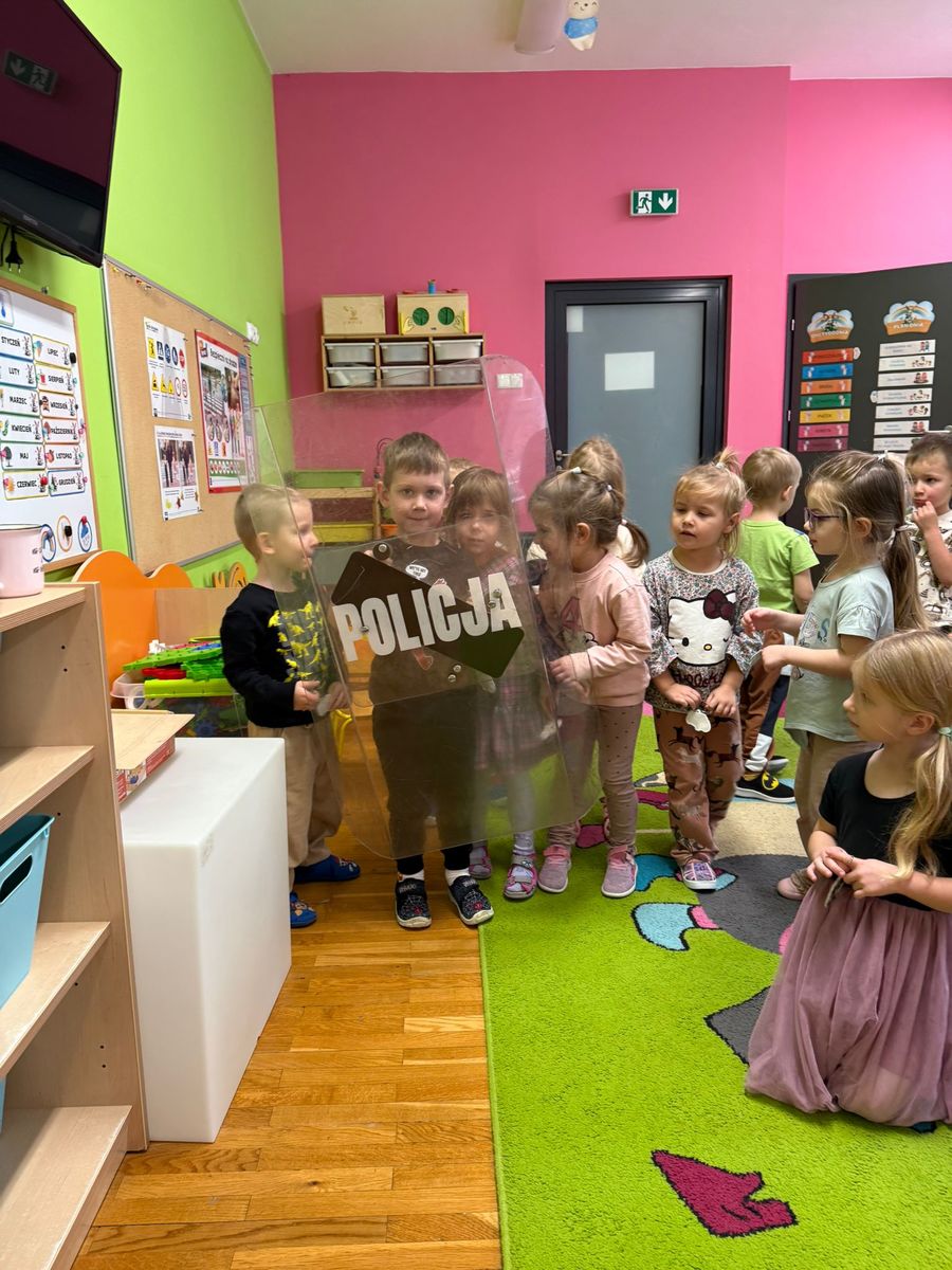 Wizyta mundurowych wśród dzieci zawsze wywołuje wiele emocji i zainteresowania, szczególnie co do zawodu policjanta. Więc była to także doskonała okazja do zaprezentowania radiowozu oraz sprzętu używanego w codziennej służbie. Podczas zajęć przedszkolaki dowiedziały się, na czym polega praca technika kryminalistki oraz czym jest daktyloskopia, a następnie mogły własnoręcznie pobrać odbitki linii papilarnych.