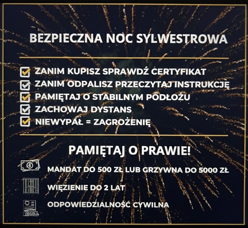 Zbliżająca się noc sylwestrowa to czas świętowania, lecz dla służb to okres wzmożonej pracy. Niewłaściwe korzystanie z materiałów pirotechnicznych może być przyczyną pożarów lub urazów ciała. Większość tych zdarzeń najczęściej wynika z nieodpowiedniego posługiwania się fajerwerkami. Przypominamy, aby zadbać o bezpieczeństwo i kupować petardy z legalnych i pewnych źródeł.