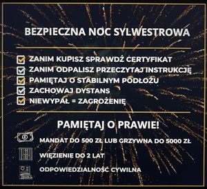 Apelujemy o zachowanie szczególnych zasad bezpieczeństwa i zdrowego rozsądku. Wyroby pirotechniczne to nie zabawki. Nadmieniamy, że powinny być używane wyłącznie przez osoby pełnoletnie i trzeźwe.