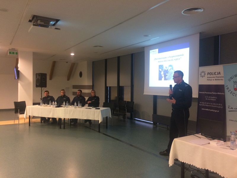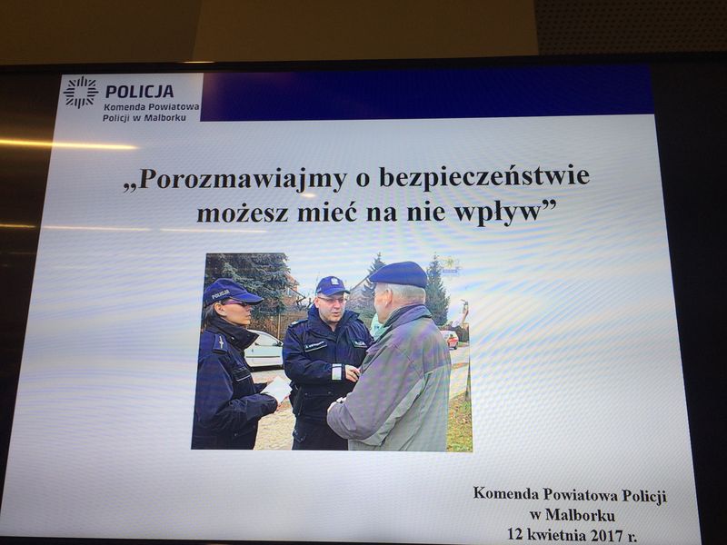 Wczoraj (12 kwietnia 2017 r.) w sali konferencyjnej Szkoły Łacińskiej w Malborku odbyła się debata poświęcona zagadnieniu bezpieczeństwa seniorów. Komendant Powiatowy Policji w Malborku mł. insp. Michał Zapolski przywitał zebranych gości i omówił potrzebę rozmowy na temat wszelkich zagrożeń, na jakie narażeni są seniorzy z Malborka i innych miejscowości w powiecie. Następnie policjantka zajmująca się profilaktyką omówiła szczegółowo oszustwa na wnuczka, czy policjanta, apelując do starszych mieszkańców o czujność i zdrowy rozsądek podczas odbierania telefonów, gdzie ktoś informuje nas, że potrzebuje pilnie pieniędzy, bo np. miał wypadek, zatrzymała go policja, lub musi zapłacić karę, aby uniknąć więzienia itp. Przedstawiła przypadki tego typu przestępstw do których doszło od stycznia br. na terenie całego województwa pomorskiego. W trakcie debaty seniorzy mogli również poznać swoich dzielnicowych tzw. „policjantów pierwszego kontaktu”, którzy na co dzień służą pomocą w sytuacjach problemowych. Policjanci na spotkaniu zaprezentowali działanie Krajowej Mapy Zagrożenia Bezpieczeństwa, omawiając najczęściej nanoszone na mapę wykroczenia i przestępstwa oraz procedurę mającą na celu wyeliminowanie zaznaczonego zagrożenia. Uczestnicy debaty podczas spotkania mieli możliwość zapoznania się z aplikacjami mobilnymi „Moja komenda” oraz z Regionalnym Systemem Ostrzegania.