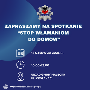 18 czerwca przypada Europejski Dzień Zapobiegania Włamaniom do Domów. W związku z tym policjanci z Komendy Powiatowej Policji w Malborku zapraszają na spotkanie profilaktyczne, które odbędzie się jutro o godzinie 10:00 na terenie Urzędu Gminy Malbork na ul. Ceglanej 7.